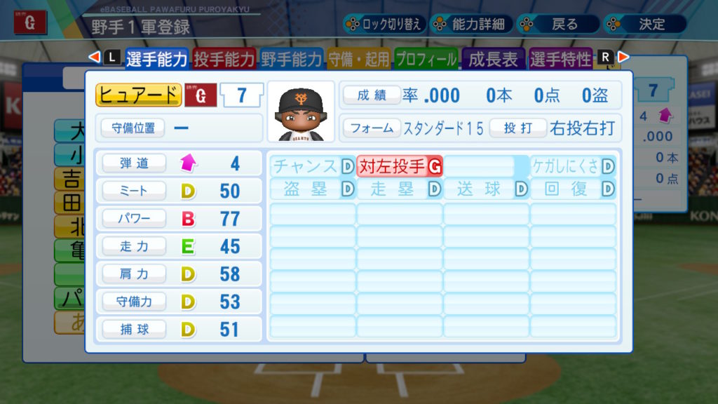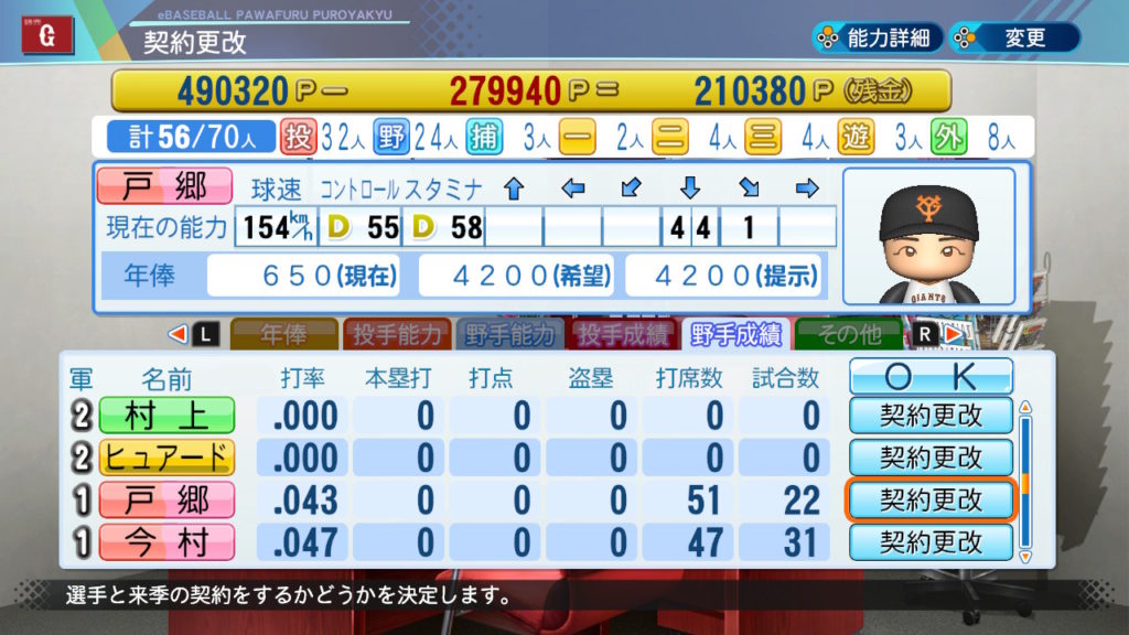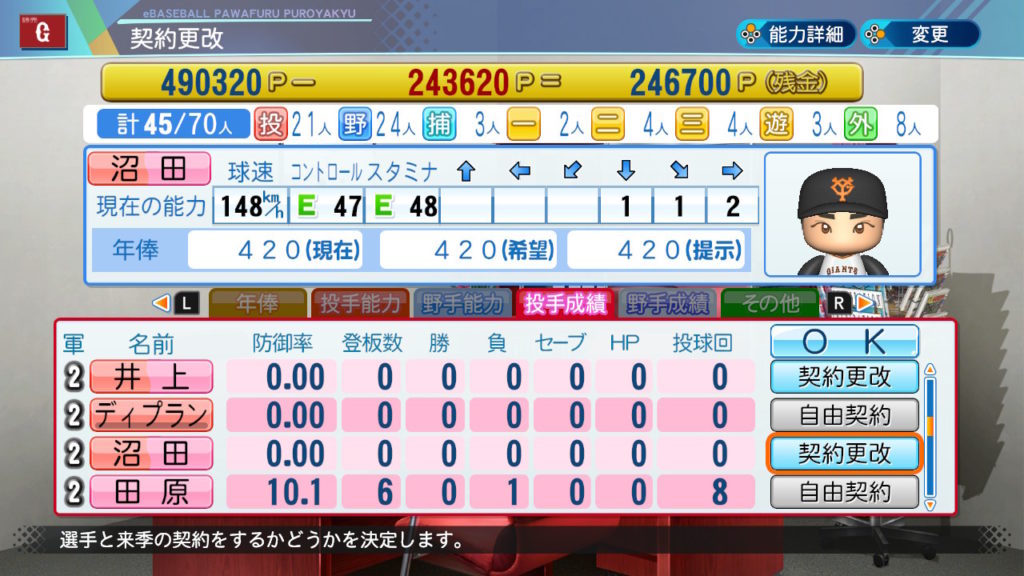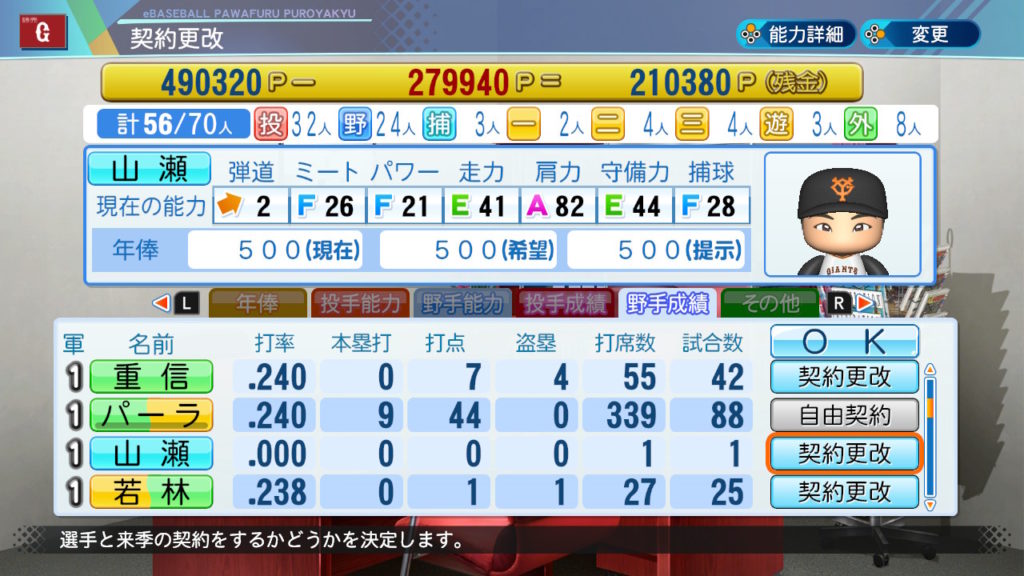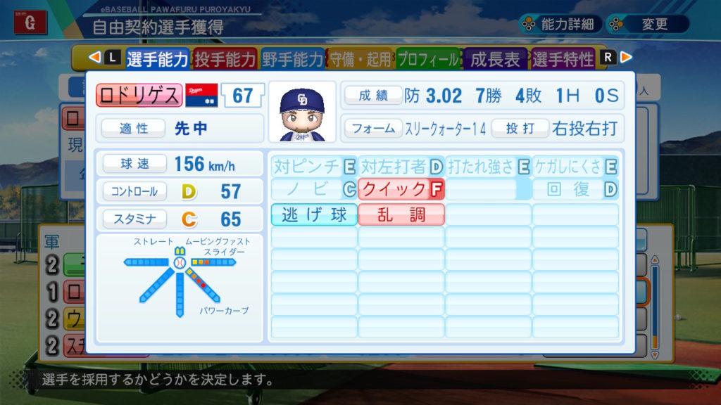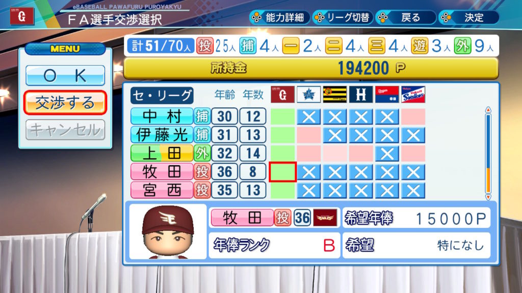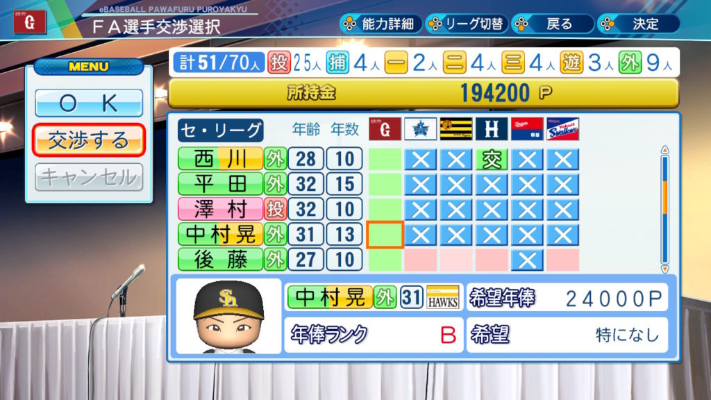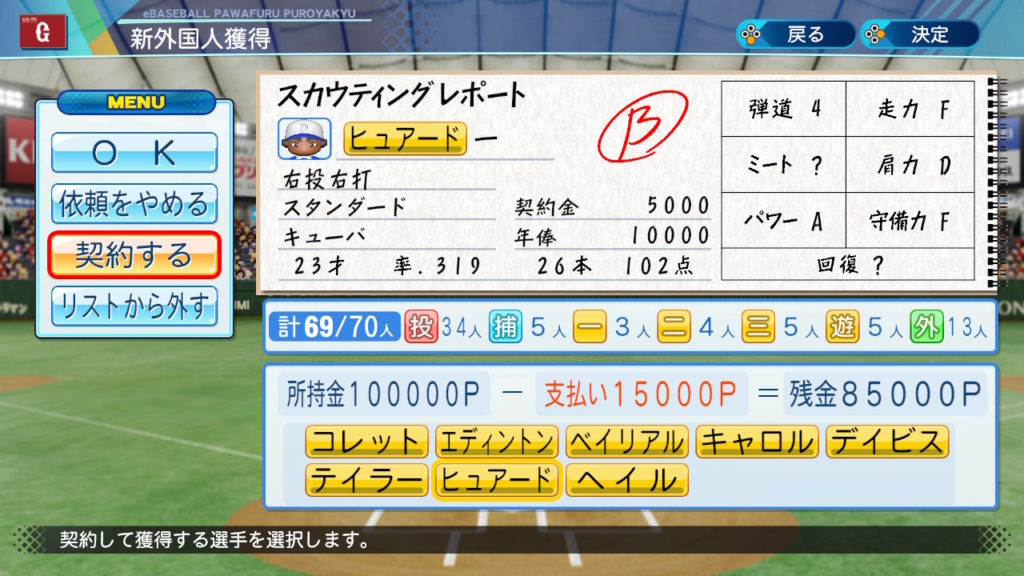 中島さんに代わるファーストを捜索するもいなかったので仕方なく唯一のBランク外国人を獲得。
