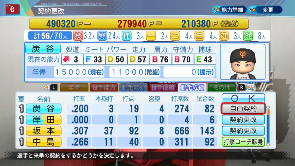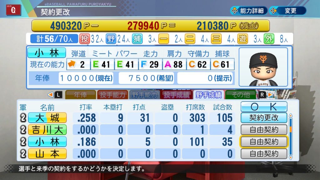 また、キャッチャーは大城さんを使ってほしいので炭谷さんと小林さんも自由契約としました。
